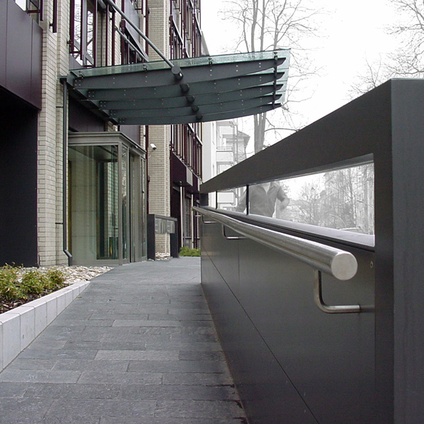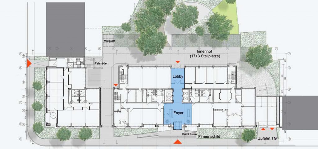 Der Zugangsbereich sowie das Foyer erhielten ein neues Erscheinungsbild. Eine neue Treppenanlage mit barrierefreiem Zugang schafft zusammen mit dem neuen Vordach ein freundliches Eingangsportal zum Verwaltungsbau.