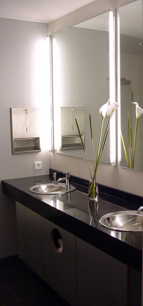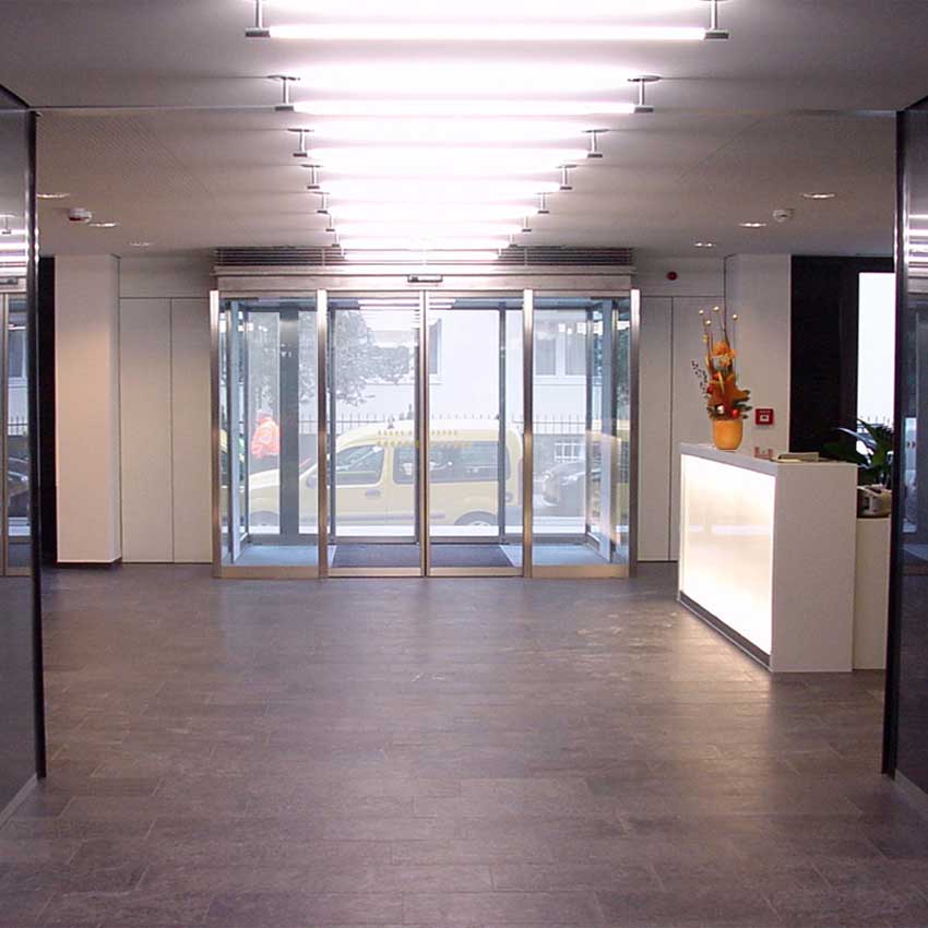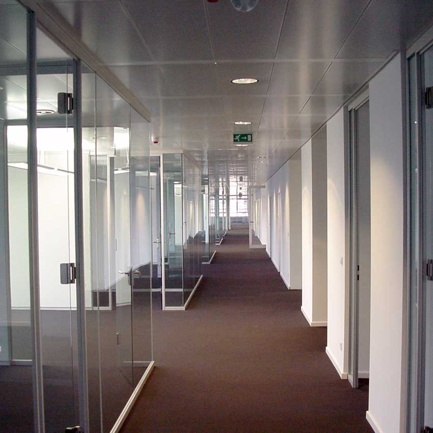 Vielfach verwendet wurden Systemwände aus Glas kombiniert mit Vollwandelementen im Bereich Büro/Flur. Sie staffeln die Raumfolgen und geben den Etagen einen offenen Charakter.