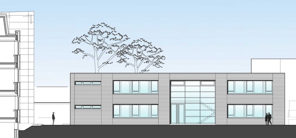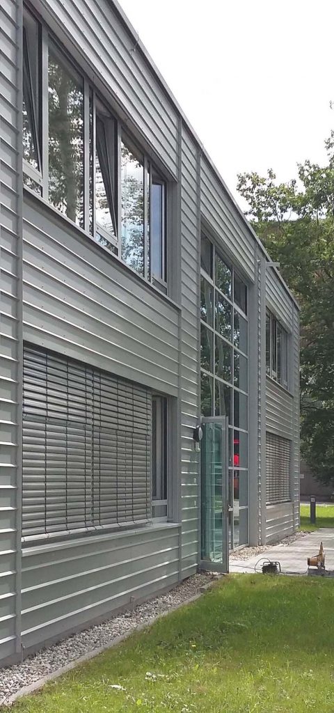 Im Süden schließt sich der gemeinsame Innenhof der Gebäude 682, 681, 695 und 696 an. Erweiterungsmöglichkeiten nach Osten (im Konstruktionsraster als zweibündige Anlage). Die Fassadenbekleidung aus hinterlüfteten Aluzackenblechen nimmt die Optik der umgebenden Gebäude auf.