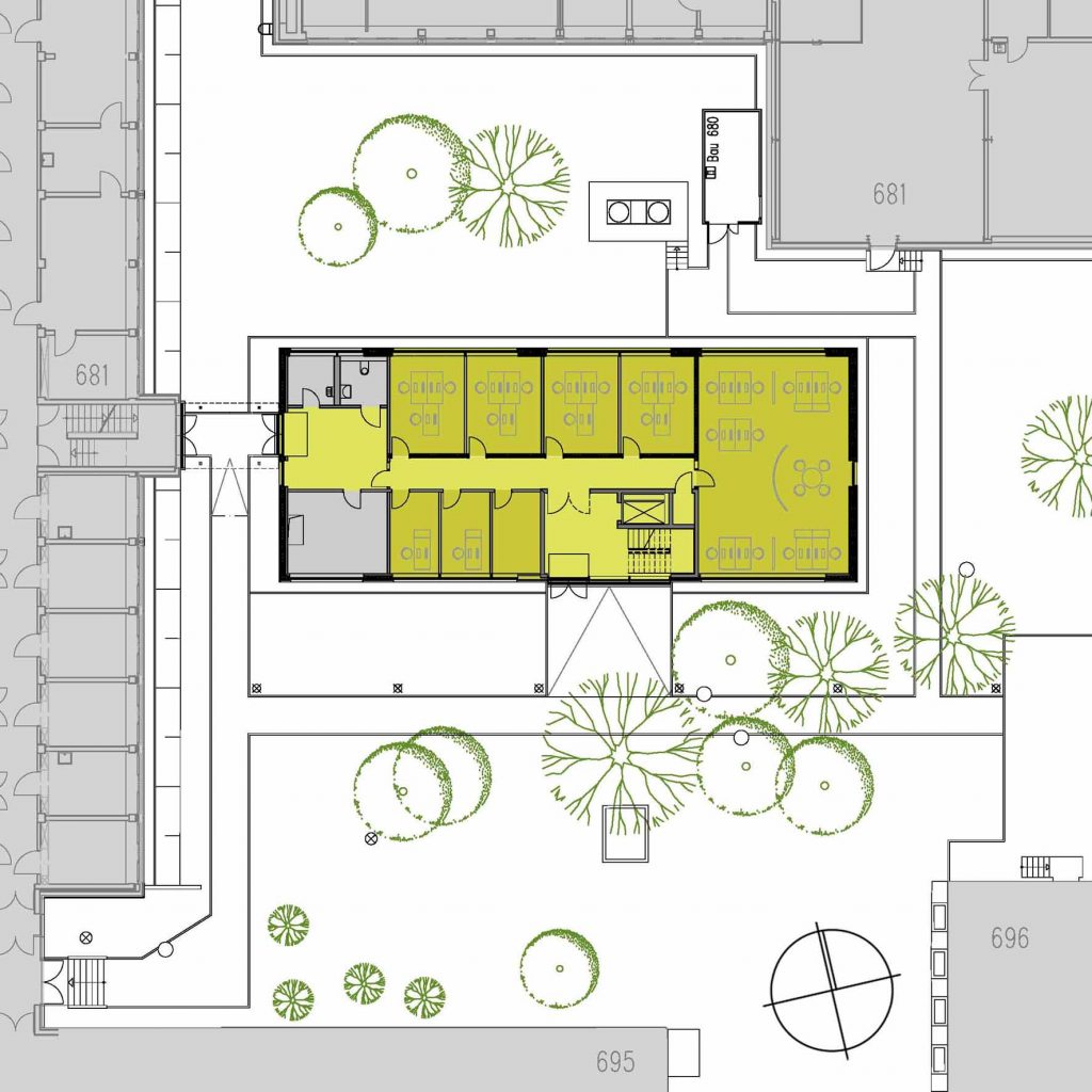 Der Neubau ersetzt den ehemaligen Bau 682 an nahezu der gleichen Stelle im Innenhof. Es handelt sich um ein zweigeschossiges Bürogebäude mit einer überdachten Anbindung an das Nachbargebäude 681.