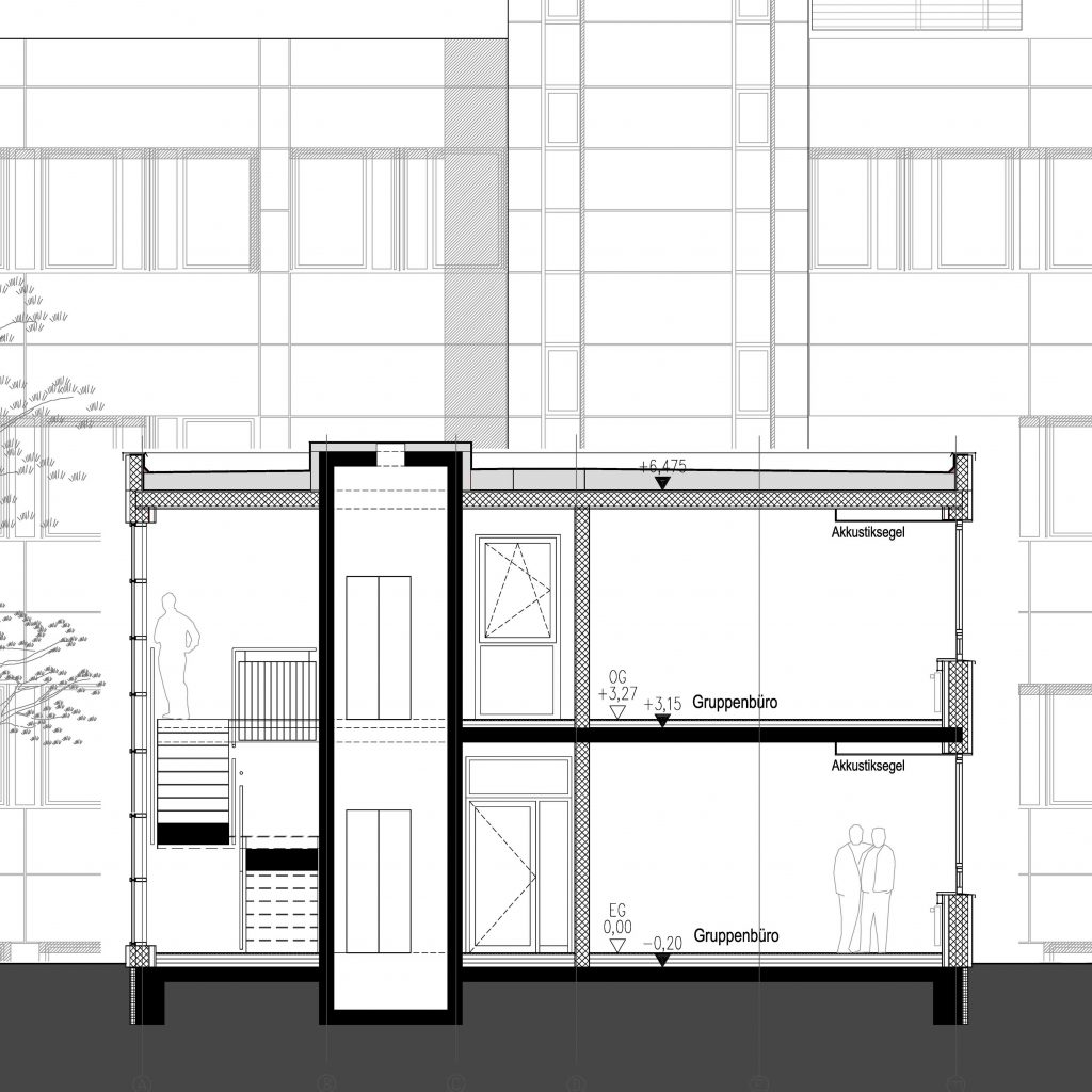 Die Büroräume sind vorwiegend nach Norden ausgerichtet, Nebenräume nach Süden. Variable Raumgrößen innerhalb eines Konstruktions-rasters von 1,30m.