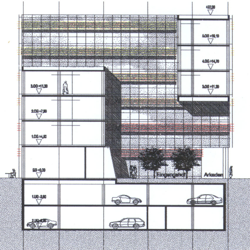 Neubau eines Büro- und Geschäftshauses Lageplan REALISIERUNGSWETTBEWERBNeubau eines Büro- und Geschäftshauses Standort: MünchenZeitraum: 2000Platzierung: Zweiter RundgangArchitekt: Manfred Raus, KarlsruheMitarbeiter: Kerstin Kohlenbach Susanne Reiss Philipp Seifert Gabriele Kemme Skizze Skizze Schnitt Grundrisse Ansicht Süd